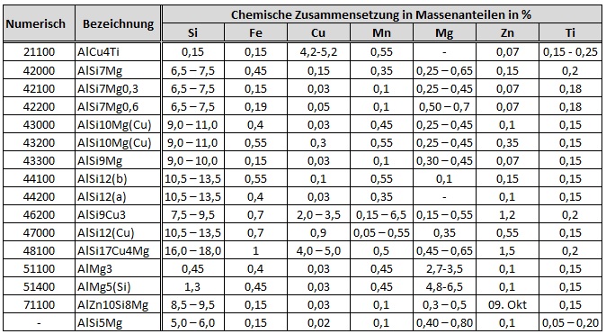 Folgende Legierungen können bei uns standardmäßig angeboten werden: